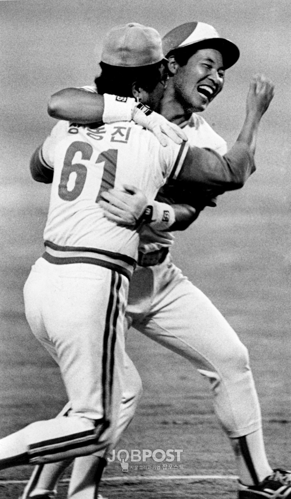 김영호 회장님이 보낸 사진은 1986년 100호 홈런을 치고 3루 작전코치인 정동진 감독님과 얼싸 안고 좋아하던 모습이다. 김영호 회장은 대구광역시 미술협회 회장을 맡고 있다.