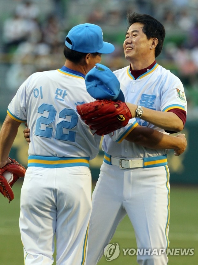 레전드의 포옹(대구=연합뉴스) 이재혁 기자 = 24일 대구시민운동장에서 열린 2010 CJ 마구마구 프로야구 올스타전에서 삼성 라이온즈의 레전드인 김시진 넥센 감독과 이만수 SK 코치가 시구, 시포를 한 뒤 포옹하고 있다. 2010.7.24 yij@yna.co.kr