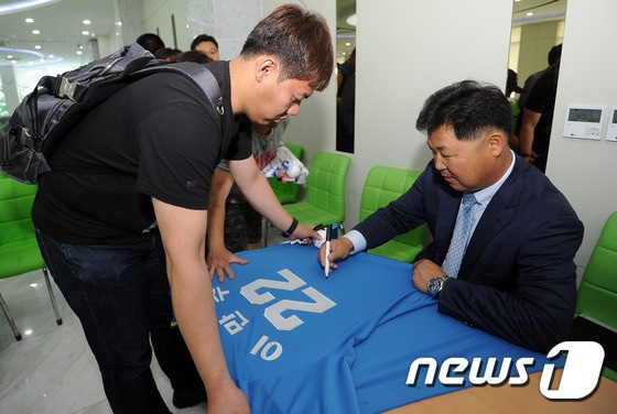 이만수 전 SK와이번스 감독이 7일 오전 대구 북구 새마을금고 침산지점에서 열린 초청 강연회에서 본인의 인생 스토리를 이야기 한 뒤 사인회를 가지고 있다. 2016.6.7/뉴스1 ⓒ News1 이종현 기자(대구=뉴스1) 문대현 기자 = 한국 프로야구계의 레전드 김시진 전 감독이 한국시리즈 3차전 시구자로 나선다. 그의 공은 이만수 전 감독이 받는다.