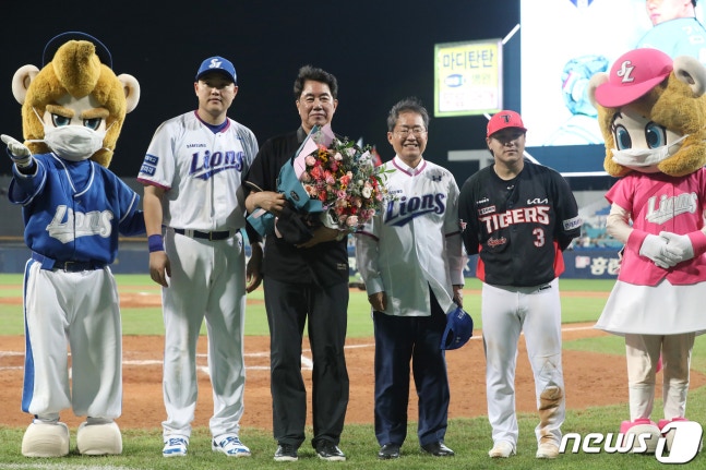 12일 오후 대구 삼성라이온즈파크에서 열린 프로야구 '2022 신한은행 SOL KBO리그' KIA 타이거즈와 삼성 라이온즈의 경기, 5회가 끝난 뒤 KBO 40주년 레전드 김시진 전 감독에 대한 시상식이 열려 홍준표 대구시장과 오재일 삼성 주장, 김선빈 KIA 주장이 함께 기념사진을 찍고 있다. 2022.8.12/뉴스1 ⓒ News1 공정식 기자