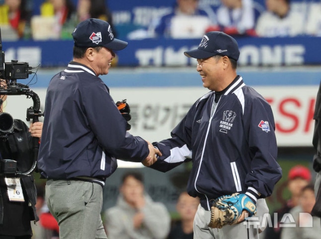 [대구=뉴시스] 김금보 기자 = 25일 대구 수성구 대구삼성라이온즈파크에서 열린 2024 KBO 포스트시즌 한국시리즈 3차전 KIA 타이거즈와 삼성 라이온즈의 경기 시작 전 삼성 라이온즈 레전드 김시진 KBO 경기운영위원장과 이만수 전 SK 와이번스 감독이 시구·시포를 마치고 인사를 나누고 있다. 2024.10.25. kgb@newsis.com