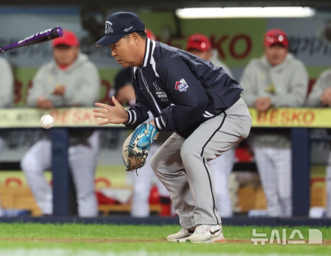 [대구=뉴시스] 김금보 기자 = 25일 대구 수성구 대구삼성라이온즈파크에서 열린 2024 KBO 포스트시즌 한국시리즈 3차전 KIA 타이거즈와 삼성 라이온즈의 경기 시작 전 이만수 전 SK 와이번스 감독이 시포를 하고 있다. 2024.10.25. kgb@newsis.com