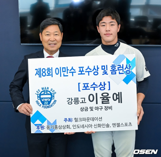 SSG 신인 이율예(오른쪽)가 19일 서울시 도곡동 야구회관에서 열린 제8회 이만수 포수상 및 홈런상 시상식에서 포수상을 수상했다.이만수 이사장은 "팝 타임이 최고 1.8초대이고 평균 1.9초대이면 이미 송구만큼은 프로선수라고 할 수 있다. 포수는 경험이 쌓여야 할 수 있는 포지션이고 나만 잘한다고 할 수 있는 포지션이 아니다. 우리 투수들의 장단점을 알아야 하고 상대 팀 타자들의 장단점을 알아야 할 수 있는 포지션"이라며 "무엇보다 리더쉽있는 성격이 정말 중요한데 이율예는 리더쉽만큼은 프로 10년 차 선수 같다. 잘 다듬으면 대한민국의 대표 포수가 될 수 있는 자질을 충분히 갖췄다"고 선정 이유를 밝혔다.
