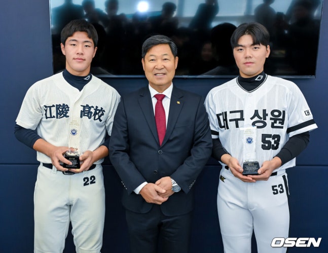 [OSEN=지형준 기자] 19일 오후 서울 도곡동 KBO(한국야구위원회)에서 제 8회 이만수 포수상 및 홈런상 시상식을 열렸다.올해로 8회째를 맞는 이만수 포수상 및 홈런상은 매년 고교 포수들 중 최고 선수와 가장 많은 홈런을 기록한 선수를 뽑아 시상한다.이만수 헐크파운데이션 이사장이 포수상을 수상한 강릉고 이율예, 홈런상을 수상한 대구상원고 함수호와 함께 기념촬영을 하고 있다. 2024.12.19 / jpnews@osen.co.kr[OSEN=손찬익 기자] 해마다 고교 선수 가운데 최고의 포수와 가장 많은 홈런을 터뜨린 선수에게 상패와 장학금을 주는 등 고교 야구 발전에 앞장서는 영구결번 출신 레전드 이만수 헐크파운데이션 이사장이 프로야구 삼성 라이온즈 신인 외야수 함수호의 어마어마한 잠재 능력을 높이 평가했다.