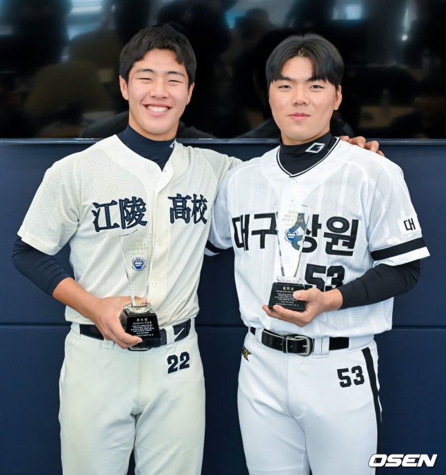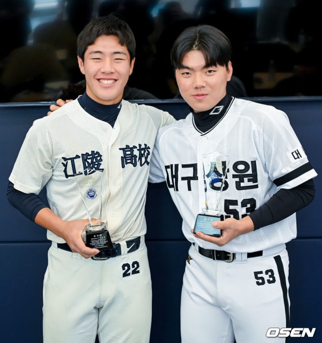 [OSEN=지형준 기자] 19일 오후 서울 도곡동 KBO(한국야구위원회)에서 제 8회 이만수 포수상 및 홈런상 시상식을 열렸다.올해로 8회째를 맞는 이만수 포수상 및 홈런상은 매년 고교 포수들 중 최고 선수와 가장 많은 홈런을 기록한 선수를 뽑아 시상한다.포수상을 수상한 강릉고 이율예, 홈런상을 수상한 대구상원고 함수호가 기념촬영을 하고 있다. 2024.12.19 / jpnews@osen.co.kr이만수 이사장은 또 “수비 능력은 프로에 와서 조금만 다듬으면 당장 내년부터 1군에 진입 활동할 수 있을 정도로 능력을 갖고 있다”면서 “신인급 포수가 경기 중 대선배 투수에게 이것저것 요구하면서 리드하는 게 쉽지 않다. 그러나 이율예 포수의 낙천적인 성격으로 인해 이미 SSG 랜더스 선수들과 빠른 시간 안에 선배들과 호흡을 맞출 것이라 믿는다”고 말했다.